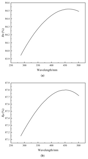 When the incident angle is 50°, the curves of reflectivity, Rs and Rp, with respect to wavelength in the range of 290–500 nm, are calculated for the complex film according to Fresnel’s formula in Figure 12 [34,38].