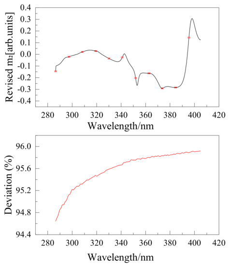 The above uncertainty analysis shows that the overall uncertainty after correction is 1.4%. The self-stability of the UV hyperspectral instrument is 1.0%, which would affect the measurement results to some extent. Moreover, the uncertainty of the polarization test system after correction is 1.0% [41]. As a result, the method of correction related to the influencing factors and the polarization properties measurement of the instrument suggested in this research may satisfy the requirements of polarization properties measuring accuracy for UV hyperspectral instruments.
