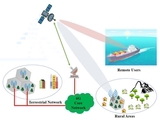 Current terrestrial systems may not be sufficient to provide services that require higher data rates with reliability and up-to-date QoS standards, especially in the harsh oceanic geographic regions [] critical for maritime communication networks (MCNs), as they suffer from coverage and capacity issues. Additionally, owing to economic and geographic constraints, terrestrial networks are mainly deployed in developed areas, such as urban areas. There are still large numbers of people and devices that remain unconnected even after construction of the 5G network. With the deployment of the 5G network, research on the 6G wireless network comes into focus to overcome these unsolved challenges. The International Telecommunication Union (ITU) has built the Network 2030 group for developing the next-generation wireless network. China has established a project to study the 6G wireless network for 2030 and beyond []. In the development targets of the 6G network, peak data rate is expected to reach 100 Gb/s to 1 Tb/s, which is 10 to 100 times higher than that of the 5G network. Latency is expected to decrease to 0.1 ms, which is a tenth of that of the 5G network. Additionally, other targets include higher positioning accuracy, higher energy efficiency, extreme reliability, larger connectivity density, and longer battery life. In the 6G white paper, it has been proposed that the future wireless network must be able to seamlessly interface with terrestrial and satellite networks []. Non-terrestrial networks and hybrid networks will play an important role to achieve this.