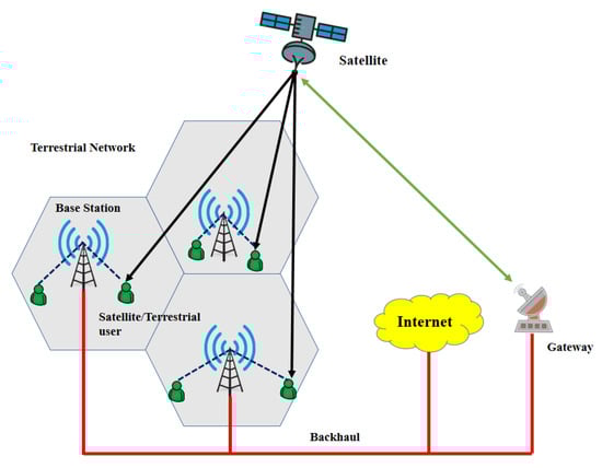 The HSTN network architecture seems promising for the 5G network and beyond to offer global coverage and Internet access by combining the attributes of both networks and providing ubiquitous communication support for IoT. HSTN consists of the conventional terrestrial networks with satellites for extension of coverage, as shown in Figure 1. The terrestrial network, which uses cellular networks and backhaul links to connect BSs to the core network, offers broadband services for developed areas. Satellites’ extensive coverage allows provide connectivity to everyone and everything in rural and remote places. Users who are not covered by terrestrial networks can use their own terminals to connect to the satellite network, albeit this may have capacity restrictions depending on the users and terminals. Additionally, satellite-based BSs and access points can be installed to deliver relatively broadband service, and users can connect to these devices using 6G or Wi-Fi technologies.