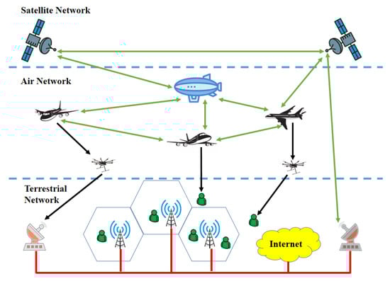 Due to their inexpensive cost and tremendous versatility, unmanned aerial vehicles (UAVs) have received much interest in recent years for use as aerial BSs. In contrast to cellular communications, UAVs can freely and adapt their movement in a 3D space, making it possible to establish line-of-sight (LOS) communication links and to prevent signal blockage and shadowing. UAVs are also seen as a possible method of achieving ubiquitous connectivity for IoT, which is fascinating from a technological perspective. However, aerial networks, including UAVs, incur significant energy consumption due to propulsion and hovering. Their intrinsic mobility could impair network performance without proper coordination and countermeasures []. Figure 3 shows the structure of an HSTN assisted by UAVs.
