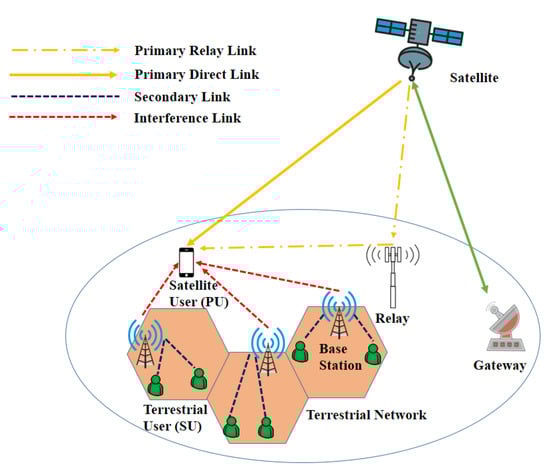 To enhance the performance of HSTNs, satellite signals may be relayed independently towards users []. Thus, the users of an HSTN can receive signals from both the satellites and the relays to take advantage of this spatial diversity from hybrid systems and to overcome the masking effect in satellite networks. This leads to a HSTN relay network, as shown in Figure 4. Many HSTN relay networks have been proposed in recent years using AF, FDF, and SDF for outage, error, and ergodic capacity analysis in the presence of co-channel interference (CCI), multi-antenna, mobile nodes, shadowing, CSI, and other conditions.