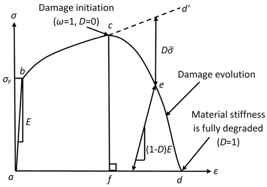 The ultimate failure of ductile metals occurs over three phases: firstly, the material begins to deform following the material elastic behavior, typically linear (phase one); subsequently, it goes into plastic deformation (phase two) that finally ends with complete fracture (phase three). Figure 1 represents the uniaxial engineering stress–strain curve of a typical ductile material, where straight-line ab represents the linear elastic behavior, which eventually reaches the yield strength , and curve bc represents the stable plastic deformation, where c corresponds to the instability strain and represents the onset point of damage; i.e., the material starts to lose its load-carrying capacity and the stiffness degradation occurs at point c. In Figure 1, curve abcd’ represents the stress–strain relationship of an intact material that did not include any damage; curve abcf represents a material that experienced sudden failure at point c; and curve abcd represents a material that experienced damage evolution, with a certain rate, after the onset of damage (point c). In other words, curve abcf is considered a special case of curve abcd.