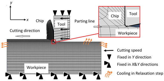 A set of coupled temperature–displacement plane strain Lagrangian models is used to simulate dry orthogonal cutting tests of steel AISI 1045 (170 HV), and subsequently predict RSs. Figure 3 presents the cutting model, which was constructed using Abaqus/Explicit, along with the applied thermal and mechanical boundary conditions. The mesh was generated, refined, and optimized and the model was tested to ensure a minimal effect on the results. A total of five models were developed and used to examine the role of different forms of damage evolution, as detailed below. The experimental cutting conditions, detailed in Section 4, are assigned to the models for validation purposes. Temperature-dependent workpiece mechanical properties are defined, as obtained from [24]. The J–C constitutive equation is used to model the workpiece flow stress. Table 1 lists the J–C plasticity parameters of the used AISI 1045, as found in [27]. For defining the chip formation, a parting line (sacrificial layer) is assumed between the chip region and machined surface, as illustrated in Figure 3. The parting line defined in the honed-tool models is thicker than the sharp-edged models to accommodate the edge radius of the cutting tool. The parting line in the sharp-edged models is 2 µm thick and is not assumed to be 16 µm, the same as the honed-tools, in order to investigate the effect of the coercive increase in the parting line on the predicted results. The workpiece has a 3 mm length and 1 mm height, where the uncut chip thickness is defined as 0.07 mm.