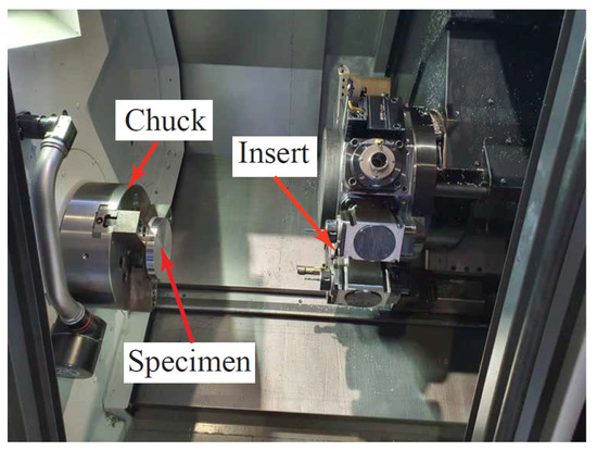 This work includes experimental investigations in order to validate the proposed Lagrangian techniques. The experimental tests were carried out using the high-precision CNC lathe (DMG MORI NLX2500/1250), where a set of orthogonal cutting tests are conducted. Figure 4 shows the workpiece mounted in the lathe during the machining operation. The cutting process was applied on steel disks of AISI 1045 (170 HV). The disks had a diameter of 150 mm and a thickness of 30 mm. The material cutting was performed utilizing double-sided rhombic diamond inserts (DNGG 150401-SF). The cutters had a 50 µm edge with a 0° and 11° rake angle and flank angle, respectively. It is worth noting that this was the minimum edge radius for this type of cutter. The cutting operations were performed under dry conditions, using a speed of 100 m/min and a feed rate of 0.07 mm/rev. A small stepover of ¼ of the tool diameter was used in this work owing to the machining of this hard steel specimen as the material was holding small details of RSs and other factors of the cutting process. Generally, the cutting parameters were selected to perform the experimental work for validation and were supported by having a noticeable effect on the investigated outputs, such as RSs, as reported in [6]. The test was conducted several times under the same conditions, while a fresh insert was used for each new cut. It is important to mention that continuous chips were obtained with no signs of phase transformation or built-up edge. The cutting forces were measured using a Kistler dynamometer.