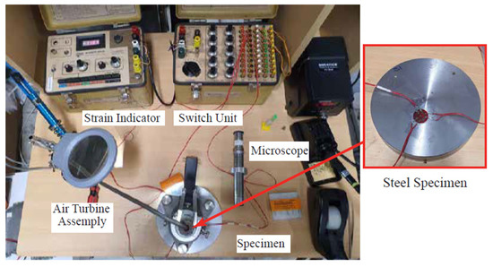 The samples were machined and prepared for measuring the induced RSs. The surface and in-depth RSs were measured and analyzed through the direction of cutting. The RSs were measured through the incremental hole-drilling method (IHDM). The IHDM was conducted in three stages, as detailed in [45,46]. A tiny hole was drilled in the area of interest, rosetta strain gauges were used to measure the induced strains, and finally the strains were calibrated numerically and the RSs were measured in the cutting direction. The IHDM apparatus is presented in Figure 5. The drilling speed was set to 20,000 RPM and the feed rate was set to 10 µm/s in the current study. These levels of the drilling speed and feed rate were chosen to achieve the best performance for measuring the stresses based on the optimization work conducted in [47]. The drilling was conducted incrementally and the calibration coefficients were determined through finite element analysis (FEA), as detailed in [13,45].