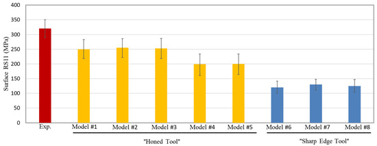 Figure 6 compares the predicted surface RS11 for the entire eight models (five using a honed-tool and the three using a sharp-tool) to the experimental IHDM value. In order to exclude the transient effects due to the cutting tool engagement and disengagement with the machined workpiece, the FEA results are extracted from the mid-third of it, which has 50 elements along the length. In Figure 6, the FEA bars represent the average value of the 50 elements and the error bars represent the corresponding standard deviation. As shown, surface tensile RS11 are predicted by all models, which agrees with the experimental finding; however, all models underpredicted the magnitude. As expected, closer predictions are obtained by the honed-edge models, which better represent the experimentally used tool. Sharp-edged models predict lower tensile RSs compared with the honed ones, which agrees with the literature [15]. Lower surface tensile RSs are attributed to lower workpiece temperatures, as shown in Section 6.4, and reflect in lower cutting forces, as shown in Section 6.2. With honed-tools, more material is ploughed into the new machined surface, which results in higher degrees of plastic deformation, which accordingly generate higher temperatures, as demonstrated in Section 6.5. In addition, higher frictional heat is obtained along the honed-edge, which is reflected in the temperature profile along the flank face [15]. The underestimation of surface tensile RSs with the honed-edge models could be attributed to the simple friction model used in the current work, which is incapable of representing the stick-slip model.