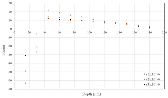 For further examination of the effects caused by the tool-edge radius and the failure models on RSs, Figure 7 shows the average values of strain measurements using the three gauges in the IHDM. The strain results were used to calculate the induced in-depth RSs inside the specimen. Thus, Figure 8a,b show the experimental and predicted in-depth RS11 profiles of honed and sharp edges, respectively. The predicted values in all of the models are lower than the experimental values of the tensile stresses near the surface. The honed-tool models are always closer to the experimental values and are able to predict the location of the peak of compressive stresses, while the sharp-tool models predict the compressive stresses peak earlier than the experimental reference. Additionally, the obtained RS distributions within the depth are close in all of the models. However, the models with temperature-based fracture energy still have lower values than the constant fracture energy models in the upper region near the machined surface. Additionally, the difference between the in-depth distributions of RSs for the linear and exponential softening models is negligible. Figure 8c–e compare between every two similar models from the sharp and honed tools models. The three figures show a difference between the obtained data of the honed-edge and the sharp-tool models, while emphasizing the effect of higher plastic deformation and higher temperature in the models with the curved cutting edge. As mentioned above, the higher plastic deformation caused higher thickness of the tensile RSs in all honed-tool analyses compared with the sharp-edged tools.