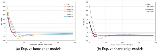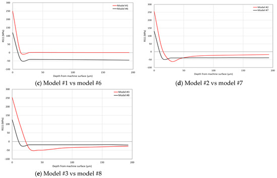In-depth RSs’ distribution in the cutting direction (RS11)—FEA models.