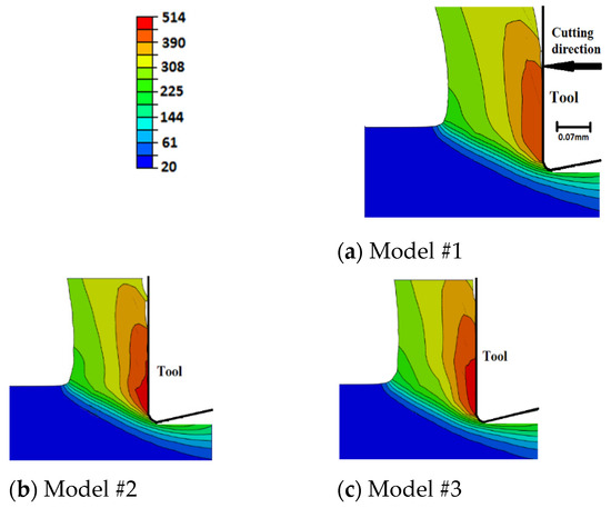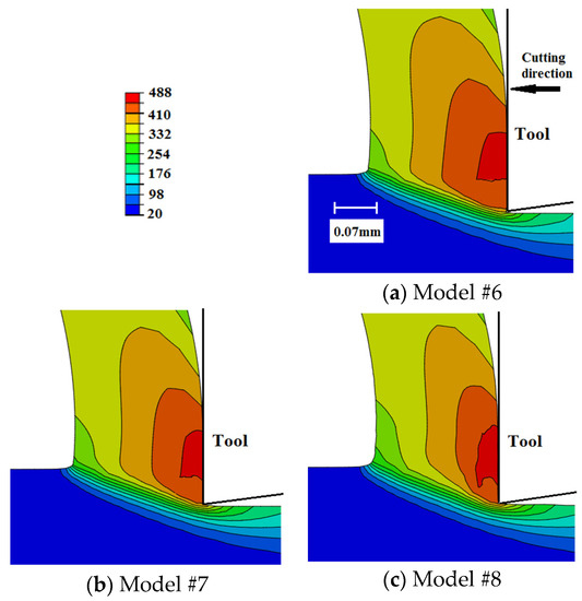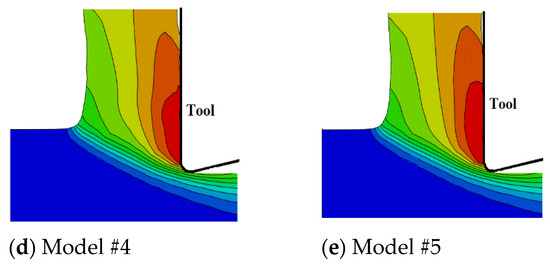 Figure 9 compares the distribution of the workpiece temperature in the chip generation region for the current models. The case of sudden failure (Model #1) predicts lower temperatures compared with the models that include the damage evolution. This is because the instantaneous material losses of its load-carrying capacity make it require less deformation energy and lead to less temperature evolution. On the other hand, temperature-dependent damage evolution models result in slightly higher temperature profiles, with no significant difference between the linear and exponential evolution rates. As the higher temperatures increase the fracture energy, models are included with temperature-dependent damage evolution exhibiting slower damage rates, i.e., higher damage resistance, which is reflected in higher temperature evolution. This is also supported by the slight increase in plastic deformation when using temperature-dependent damage evolution models, as shown in Section 6.5. Overall, Model #5 (exponential damage propagation based on temperature-dependent fracture energy) predicts the highest workpiece temperature, with a maximum difference of about 7% as compared with Model #1 (sudden failure).