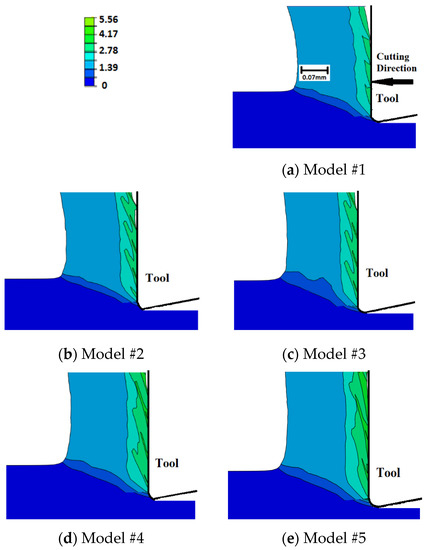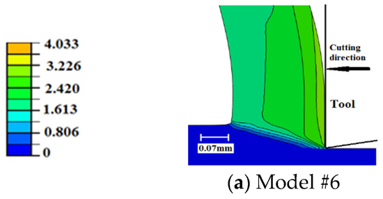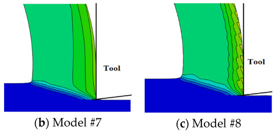 Comparing the current results to those of sharp-edged tools, Figure 12 [27], it is obvious that using honed tools results in higher magnitudes of plastic deformation, which agrees with the literature [15]. Furthermore, the differences between the three sharp-tool models are less evident than the corresponding models with honed tools, which means that the damage evolution role is less evident when cutting with sharp tools. Moreover, for sharp tools, an intermittent distribution of plastic strain along the rake face is only obvious when exponential damage evolution is used (Model #8). The less significant role of damage evolution when using sharp tools can be attributed to the size of the parting line, which is smaller in the case of sharp tools. A thinner parting line means less material to be removed and, accordingly, the impact of element deletion on plastic deformation becomes less evident.
