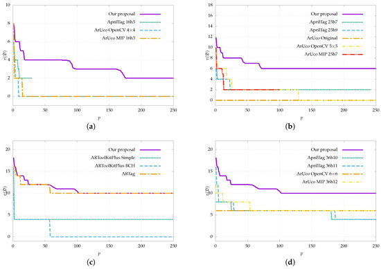 The only dictionary that comes close to the results of our proposal is that of ARTag, as it is the only one that considers the possibility of reflection. Even so, our proposal outperforms ARTag in nearly all cases. Although it is difficult to appreciate, the only exception is for dictionary sizes between 52 and 57, where ARTag reaches an inter-marker distance of 12 and some executions of our proposal drop to 11. In any case, this only represents of the total number of executions, so we can state that our method clearly outperforms ARTag’s dictionary. Apart from ARTag and our proposal, the best performing dictionary families are AprilTag and ArUco MIP. The other ArUco dictionaries and, in particular, the ARToolKitPlus dictionaries show worse results.