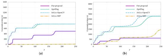 The generation was configured in a similar way to that proposed in [22]. All tests were performed using a system equipped with an Intel Core i7-3930K 3.20 GHz processor and 16 GB of RAM. The results of our proposal correspond to the dictionaries generated for the experimentation of Section 4.1. Figure 5 shows the generation times for two typical marker sizes of 4 × 4 and 6 × 6 bits.