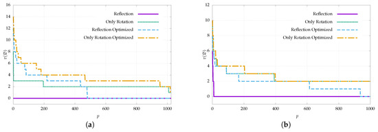 It can be seen that, when considering reflection, we obtain better results in nearly all cases and in the rest we equal them, but we never obtain worse results. The improvement is almost always highly significant. For instance, the ArUco OpenCV 6 × 6 dictionary of size 800 achieves an inter-marker distance of 0 before optimizing, which makes it unusable since one marker can be confused with another simply by being reflected even if the bit extraction is perfect. After applying the optimization, an inter-marker distance of seven is achieved, which allows correcting up to three incorrect bits.