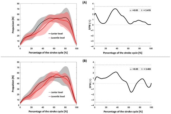 Figure 2 shows a comparison of the propulsion time-series by SPM: Panel (A)—between junior and juvenile swimmers for the dominant upper limb; Panel (B)—between junior and juvenile swimmers for the non-dominant upper limb. SPM produced non-significant (p > 0.05) differences between all pairwise comparisons.