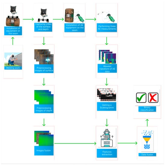 The contribution of our research is as follows: firstly, we propose a novel approach to correctly combining the data obtained from visual inspection using an RGB-Depth camera and an AE setup using sensors. Then, we present and describe this approach in the form of a surface inspection system with intelligent decision making capabilities. The general block diagram of the proposed study is introduced in Figure 1.