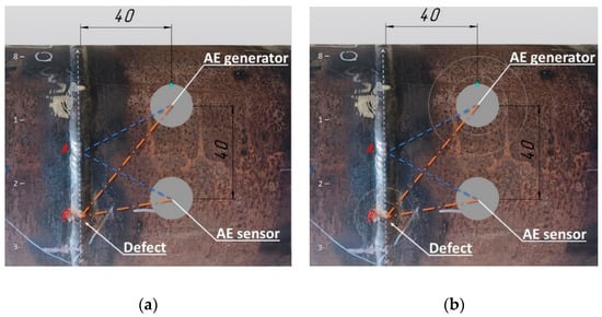 Despite AE methods being volume sensitive, the correct determination of the placement of the weld defect directly depends on accurate sensor placement. In our research, these aspects are detailed in Figure 5.