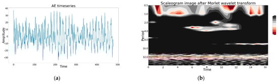 Due to integrated data fusion, AE timeseries were transformed with the described method, and the resulting output was the dataset containing graphical wavelet representation as a set of scaleograms (in the form of images). A sample scaleogram image from the dataset after Morlet wavelet transform and its corresponding AE timeseries are shown in Figure 7a,b, respectively.