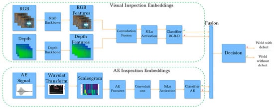 The details of the experimental setups, dataset samples, DCNN architectures, and source codes for the proposed approach are found in the following repositories: (1) the main repository, which contains fusion techniques and is located at https://github.com/cybervllc/weldfs (accessed on 30 September 2022); (2) the details of the RGB-Depth data acquired based on web interface from an Intel RealSense D435i camera, which are located at https://github.com/cybervllc/weldrs (accessed on 30 September 2022); and (3) the details of AE processing and the samples of AE data, which are located at https://github.com/cybervllc/acoustic_emission (accessed on 30 September 2022).
