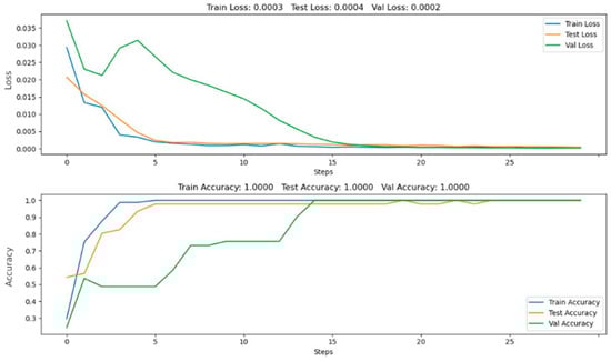 The learning quality metrics obtained, the model validation at the early fusion of RGB image data, the depth images of the measured object, and the AE data are presented in Figure 12.
