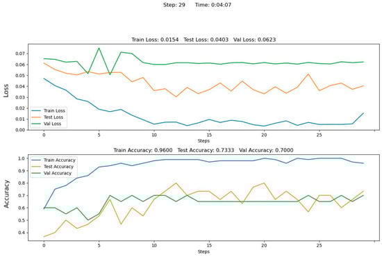 We considered the training processes of the residual network and its final characteristics for the case of classification. This consideration is based only on the image data of weld surface weld depths and scaleograms characterizing the AE method of NDT. All of the above cases were implemented using the ReLU and SiLU activation functions. Training was performed on the same number of measurements within the datasets. We trained the DCNN model with training hyperparameters, and for all cases they were as follows: epochs—25, batch size—32, learning rate—0.003, and momentum—0.9. An example of the training results is presented in Figure 11.