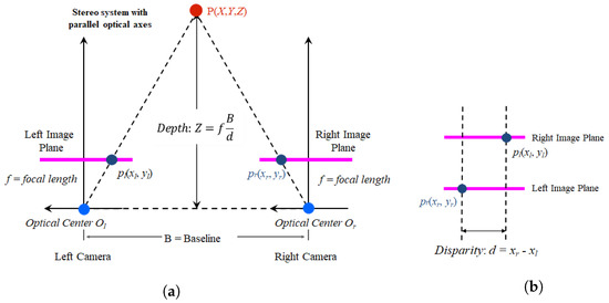 Generally, stereo matching calculates disparity using the relationship between two images (the left and right images), where two photos of the same scene are simultaneously captured by two cameras installed in two different locations. Figure 1a shows a camera setup for capturing a stereo image, and Figure 1b shows the disparity. A pixel (or a region) in the left (reference) image is searched in the right (target) image, with the goal to find a position of an object in the left image in the right image. The horizontal distance () between the corresponding pixel (or region) of the two images is defined as the disparity. The disparity is converted to depth using physical information from the capturing equipment, and the 3D position is then estimated from the depth [33,34].
