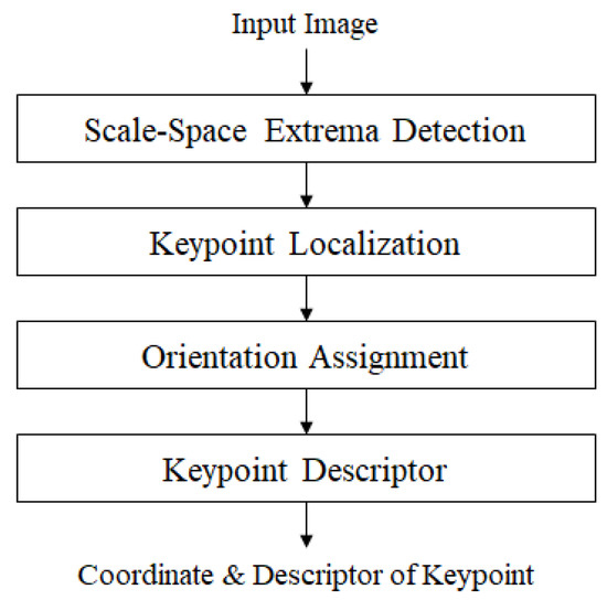 The SIFT has four steps: scale-space extrema detection, keypoint localization, orientation assignment, and keypoint description, as shown in Figure 2. The scale-space extrema detection step produces keypoint candidates. The image is convolved with Gaussian filters at different scales, then the differences of successive Gaussian-blurred images are taken. Keypoints are then taken as the maxima/minima of the Difference of Gaussians (DoG) that occur at multiple scales. A DoG image is provided in Equation (1):