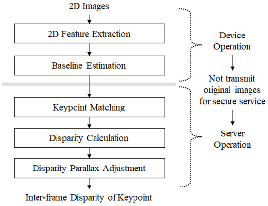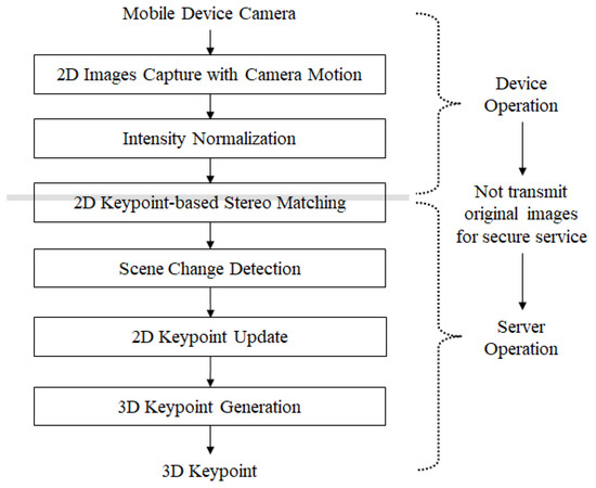 The 3D feature extraction step consists of device and server operations. Device operation consists of two steps: 3D image capture and intensity normalization. Figure 3 shows the proposed algorithm for the 3D feature extraction. First, 2D image capture with camera motion captures 2D images according to the movement of a mobile device. This step normalizes the image intensity. Intensity normalization is performed through a simple histogram equalization which enhances the image quality on the side of brightness. Through intensity normalization, dark or bright images are changed to images with a typical intensity scale. Next, 2D keypoints are calculated by stereo matching. This step is carried out on both the device and server. A 2D keypoint generated on the user’s device is transmitted to the server. Finally, the scene change is detected using the relationship between the 2D keypoints of the frames, and the 2D keypoints to be stored are selected by the server.