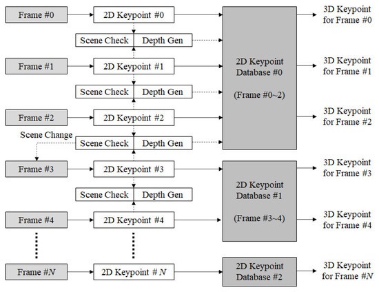 Figure 9 illustrates the database of the 3D keypoints that are finally saved. As shown in Figure 9, among the 3D keypoints updated by Frame #0, overlapped keypoints are not stored in the database, as they duplicate the keypoints on Frame #1. Furthermore, this relationship is maintained for the subsequent frames. In this way, the information of keypoints and keypoints stored in the 3D keypoint database is minimized.