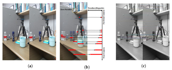 Parallax (or disparity) analysis between stereo images: (a) stereo images, (b) parallax analysis result, (c) keypoint generation.