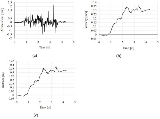 The baseline represents the actual distance traveled by the camera. In general, stereo cameras have a fixed baseline. In this paper, the baseline is estimated by measuring the acceleration value of the gyrosensor according to the movement of the camera. Acceleration values were obtained while moving the camera for 4.32 s, and the actual moving distance of the mobile device was measured by 45.73 cm using a laser range finder. Figure 10a shows the acceleration obtained from the gyrosensor, Figure 10b the velocity, and Figure 10c the estimated distance. The distance obtained through acceleration showed a total movement of 45.11 cm, and the error that occurred was 0.62 mm. These results verified that the distance of the mobile camera estimated using the acceleration measured from the gyrosensor can be used to estimate the baseline.