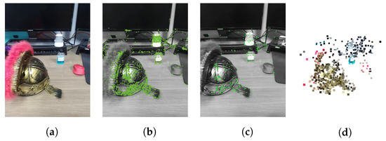 Keypoint-based stereo matching result: (a) RGB image, (b) keypoints of the previous frame (the left image), (c) keypoints of the current frame (right image), (d) 3D keypoints result plotted in a 3D space with RGB information.