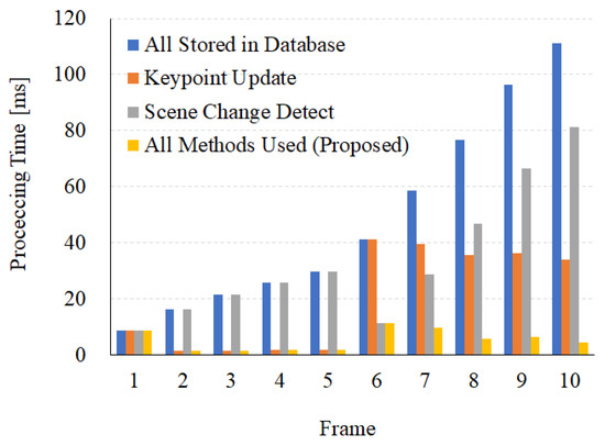 The processing time required to calculate a new 3D keypoint was observed for the keypoint update and scene change algorithm. The experiment was conducted using a sequence with ten frames, with a scene change in the 6th frame. Ifthe keypoints are updated without the keypoint update and scene change algorithm, all new keypoints are stacked in the database. Furthermore, when a new scene starts, new keypoints are matched with the previous ones with totally different features. The first frame has a processing time of 8.68ms. The calculation time for five frames is 15.03 ms and 101.86 ms during the scene change when using and not using the keypoint update algorithm, respectively. After the scene change, the processing time is 37.4 ms in both cases. If all keypoints are stored in the database, it takes 383.68 ms. When using the keypoint update algorithm, it takes 186.75 ms. When the database is initialized and divided by the scene change algorithm, it takes 11.43 ms at the 6th frame and 234.45 ms for the other frames. The processing times for ten frames are 383.68 ms, 186.75 ms, 234.35 ms, and 37.41 ms. These results translate to a performance enhancement of 10.25 times. Figure 15 shows the processing times in the case of not using the keypoint update and scene change, the case of only using the keypoint update, the case of only using the scene change, and the case of using all algorithms.