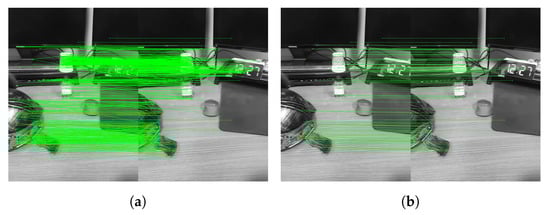 An example of the results of scene change detection is shown in Figure 13. Figure 13a shows a case where scene change does not occur, and Figure 13b shows the result when a scene change occurs. In the two figures, the upper two figures are the original RGB images, and the lower two figures are the keypoint extraction results. In Figure 13a, the overlapped keypoint between the previous and current frames is 74.57%, a result that can be considered as no scene change. In Figure 13b, the overlapped keypoint between the previous and current frames is 5.76%, a result that can be considered a scene change. When visually confirming Figure 13a, it seems that the change between the two frames is large; however, there was no significant change in the keypoints. Figure 13b shows the same scene shot from different angles. However, if the characteristics of the keypoint descriptor are different depending on the angle, it may be judged to be a different scene. Because this paper proposes a method for obtaining keypoints, the similarity of the descriptors of the keypoints is more important than the visual similarity.