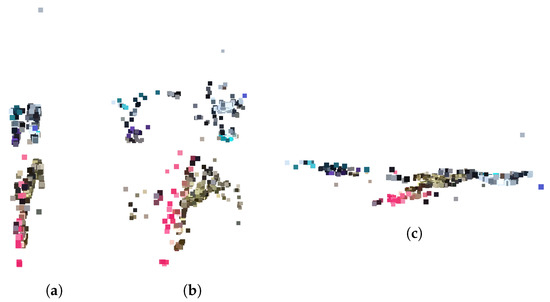 Setting the baseline is very important when converting the estimated disparity into depth. It is necessary to generate the z-axis coordinates of the 3D keypoint as well. We conducted an experiment according to the method of setting the baseline. Based on the experimental results, the baseline in our experiment was fixed at 55 mm. The experiment was performed to check how the 3D keypoint is positioned in space. For this experiment, 3D keypoints were extracted while adjusting the length of the baseline in three ways. Figure 17a shows the result when the baseline is 10 mm, Figure 17b shows the result when the suggested distance is 55 mm, and finally, Figure 17c shows the result when the baseline is 150 mm. Observing the three results, correct 3D keypoints were not generated when an appropriate baseline was not set. In the case of Figure 17a,c, the space was compressed and severe distortion occurred. In the case of Figure 17b, the space was normally formed by the 3D keypoint.