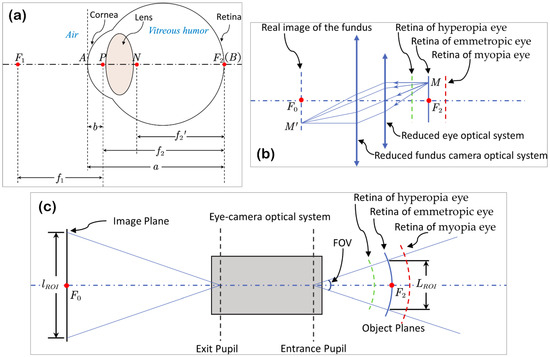As in the reduced emmetropic eye model, the retina is coincident with the second focal plane of the eye optical system, the fundus camera performs like a telescope together with the eye, and the optical rays between the eye and the camera will form a parallel beam. The imaging process of the fundus camera can be described by Figure 1b. Note that the retina layer near the eye axis is illustrated as a plane for simplification.