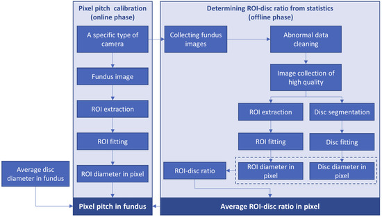 In the online phase (to estimate the pixel pitch of a fundus image): for a macula-centered fundus image, the ROI diameter in the pixel can be measured by the algorithm in Section 2.2.2, and the pixel pitch in fundus (near the optic disc) can be estimated according to Formula (6), given the ROI–disc ratio in pixel obtained in the offline phase.