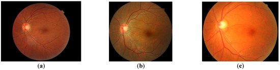 ROI is the valid area on the fundus image, that is, the area where fundus structures can be seen in the fundus image. It is generally located in the center of the image and is a circular area (Figure 5a). However, due to the difference of camera parameters, the shape of ROI may not be a complete circle in the fundus image, but it may be cropped to various extents (Figure 5b,c). Therefore, the ROI detection algorithm should be able to accurately identify the diameter of ROI when it is an incomplete circle.