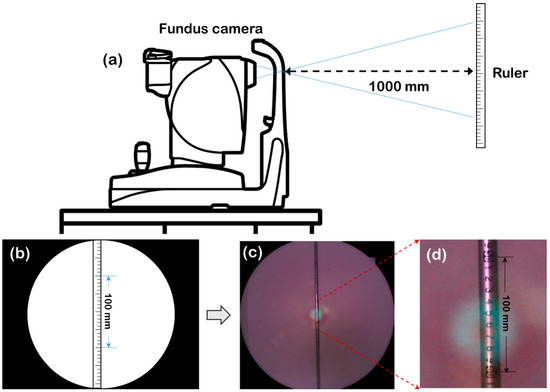 - Nittala, M.G.; Hariri, A.; Wong, W.T.; Chew, E.Y.; Ferris, F.L.; Sadda, S.R. Image Scaling Difference Between a Confocal Scanning Laser Ophthalmoscope and a Flash Fundus Camera. Ophthalmic Surg. Lasers Imaging Retin. 2015, 46, 872–879. [Google Scholar] [CrossRef] [PubMed]