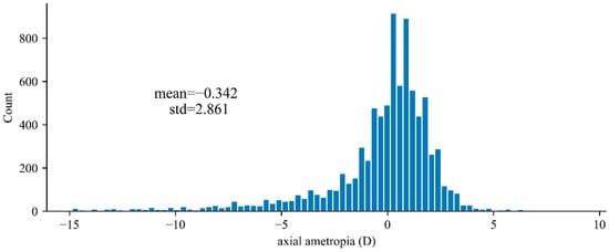 According to the database of Shanghai, the distribution of the axial ametropia of 9364 eyes of 4682 individuals is shown as Figure 8. It can be seen that most of the diopters of the eye are around zero, and the mean value and standard deviation of the diopter are −0.559 D and 3.522 D, respectively.