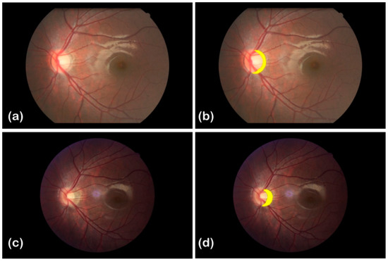 Fundus images of a myopic patient in 2012 and 2016. (a,c) are the fundus images taken by Cannon cameras of different models in 2012 and 2016, respectively. (b,d) are the labeled versions of (a,c), respectively, and show the regions of the atrophic arc highlighted in yellow. The areas of the atrophic arc regions are 17,586 px and 16,521 px in (b,d), respectively.