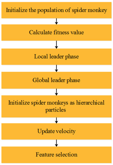 | 1: Input: Intrusion detection feature set and population size 2: Output: Optimal feature set 3: Initialize SM Population, Probability, Parameters, Local Leader limit and Global leader limit particles with hierarchy in the population. 4: Calculate the importance of each feature. 5: Evaluate the fitness of all SM. 6: Compute leaders of global and local level leader agents for feature subset. 7: While iteration 8: For 9: Calculate fitness for every particle using Equation (9). 10: Update particle’s local best position as per hierarchical position. 11: Based on hierarchical particle velocity update position of all spider monkeys. 12: End for 13: Select group members by applying greedy selection method 14: Update SM’s global optimal position 15: For 16: Perform local and global leader learning phase using Equations (5) and (6). 17: Update particle’s velocity with hierarchy using Equation (2). 18: Update SM’s global best position. 19: End for 20: End while |