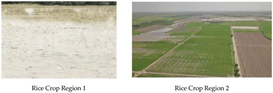 The study was carried out in Tando Muhammad Khan, Sindh, Pakistan, in June 2020. A total area of 40 acres was chosen for the study and divided into two regions. Region 1 (5 acres) (25°08′16.4″ N, 68°35′26.5″ E) and region 2 (35 acres) (25°08′12.9″ N, 68°36′08.9″ E). For the acquisition of images, a DJI Phantom 4 Pro drone was used. The UAV, flight assignment, and specifications of the camera are shown in Table 1 and Table 2. A predefined flight plan was developed using a mission planner Map Pilot for DJI software. The UAV flew autonomously over the rice field at 35 m. To eliminate the chance of data distortion and to stabilize the flight during image acquisition, the experiment was performed in June 2020 on a sunny day in considerably low winds. The images were acquired with the overlap of 70% Along Track and 60% Across Track to fulfill the total coverage of the study area.
