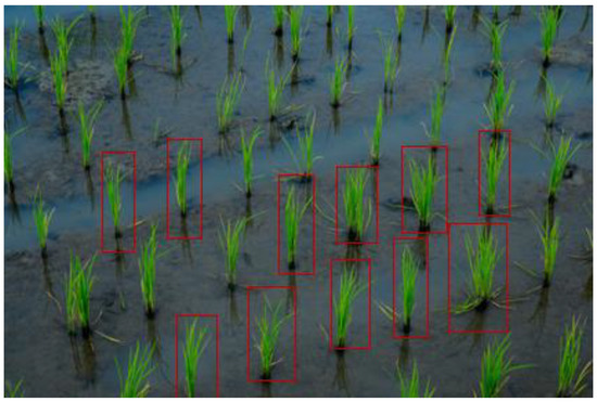 Figure 3 illustrates the training samples for extracting features. The red bounding boxes show the rice training sample based on the system detecting rice crops. Once the image is captured, the next step is to prepare a test and translate the image into the configuration of a deep learning model that has to be given descriptions of images of rice plants or seedlings so that it can identify comparable pixels in order to understand what it is supposed to be detecting. Creating realistic training assessments is essential when teaching a profound learning model or any picture grouping approach. Additionally, it is typically the longest advancement overall. To give a deep learning model the information it requires, rice plants or seedlings must be highlighted to show the algorithm their potential sizes, shapes, and marks, as shown in Figure 3.