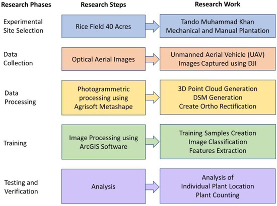 In Figure 4, the research is presented as data collection is carried out in rice fields. The area of the rice field is about 40 acres, where the mechanical and manual plantations both are carried out. The experimental site is at Tando Muhammad Khan, where the UAV flew to collect imagery data of the field. The data are the optical images that are processed to remove outliers and garbage data for image processing. Training Samples Are created, and image classification is performed to train the model for selecting individual plant locations and counting plants as well.