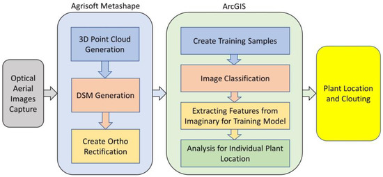 The system block diagram explains the working model adopted in this work. In Figure 10, the workflow chart of this research is presented as images captured using UAV, and then the images are processed with AgiSoft Metashape Professional Software (AMPS). In AMPS, ortho rectification is generated by 3D point and DSM generation. After ortho rectification, training samples are created through which image classification is performed, which extracts features for the training model. Plant location and plant count are identified by the analysis of location. This flow of work helps to identify the location-based plant count from which the highly populated, less populated, and barren land can be identified easily.