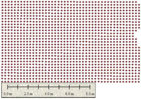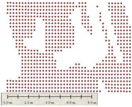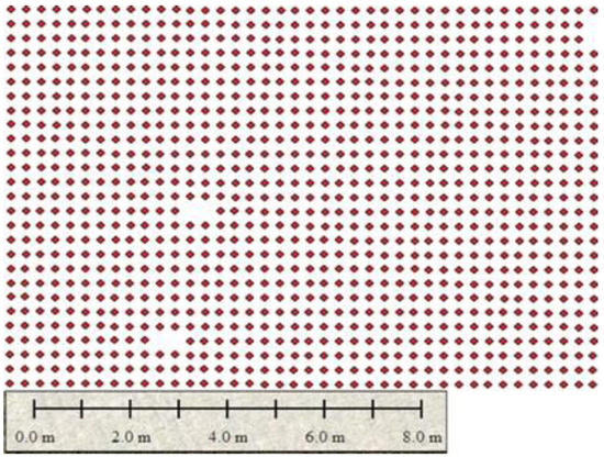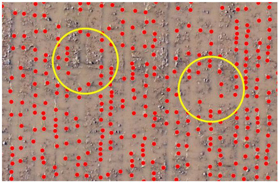 Figure 13 shows the sowing pattern of plants in areas (1, 2, and 3) of region 2. These plants are mechanically grown, and a dotted pattern shows the growing areas, and empty spaces indicate the problematic area. The images in Figure 11 show the point demarcation of red color dots on the field, which shows the fertile and barren region of land.