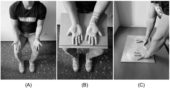 The CST consisted of placing and pressuring the hands on an aluminum plate [17,18] for two minutes [19]. The images of the recovery of the palms were then taken every minute for 5 min after the CST ended [19] to monitor the hands’ rewarming pattern (Figure 1C). The plate was placed in the same measurement room for the correct stabilization of its temperature before the participants arrived. Up to this step, the same protocol was carried out for both groups.
