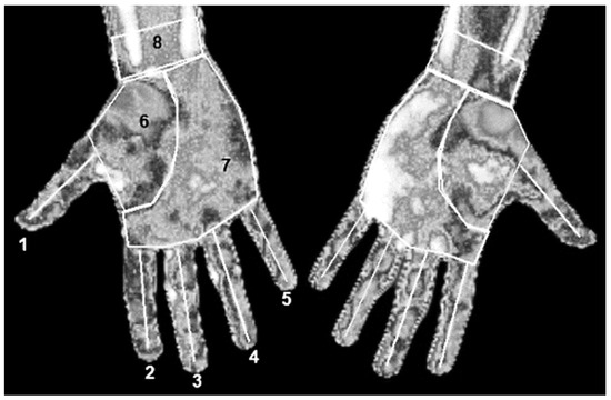 Regions of interest determined. (1) Thumb; (2) Index finger; (3) Middle finger; (4) Ring finger; (5) Little finger; (6) Thenar eminence; (7) Palm without thenar eminence; (8) Wrist.