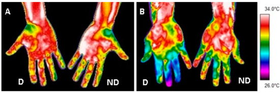 Example of the thermal images at baseline condition in a member of the control group (A) and a member of the athlete group (B). D = Dominant Hand; ND = Non-Dominant Hand.